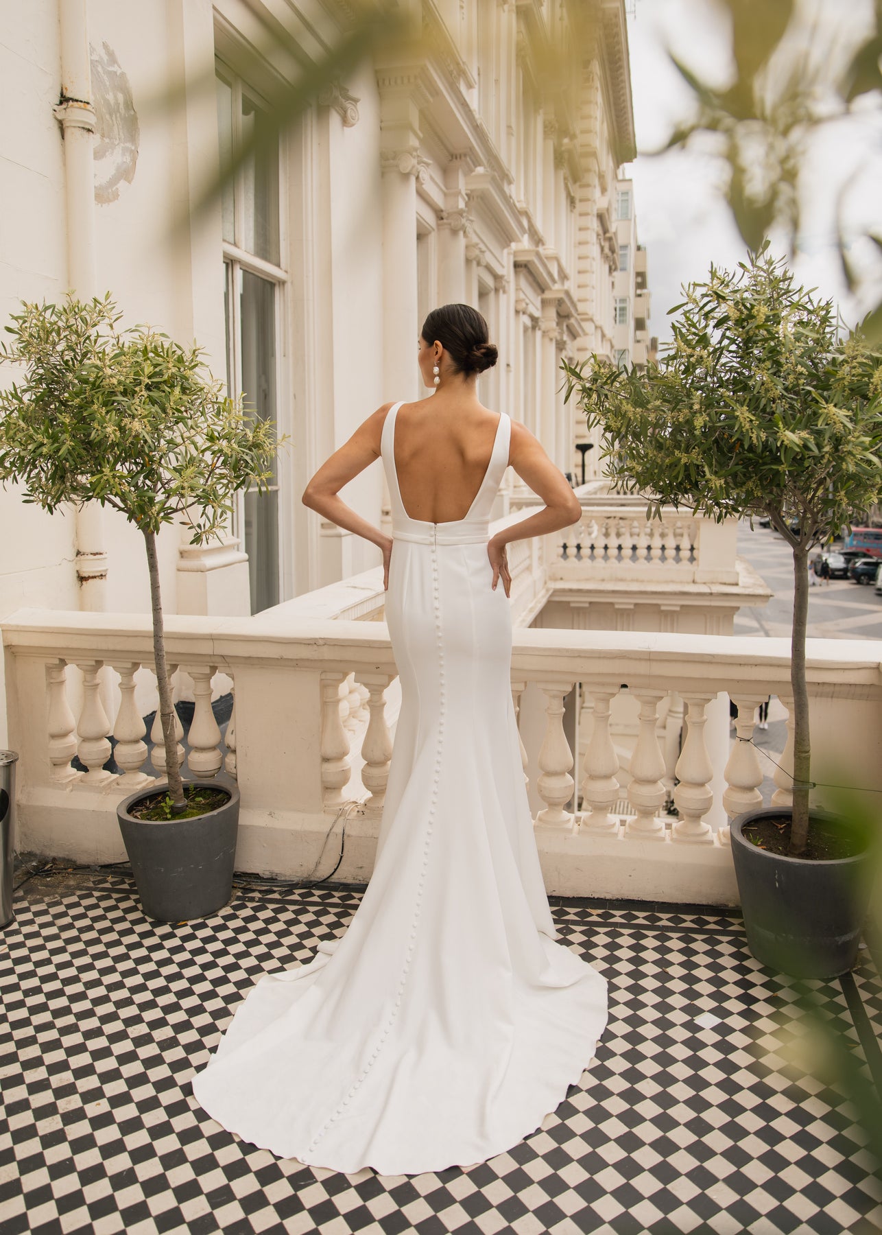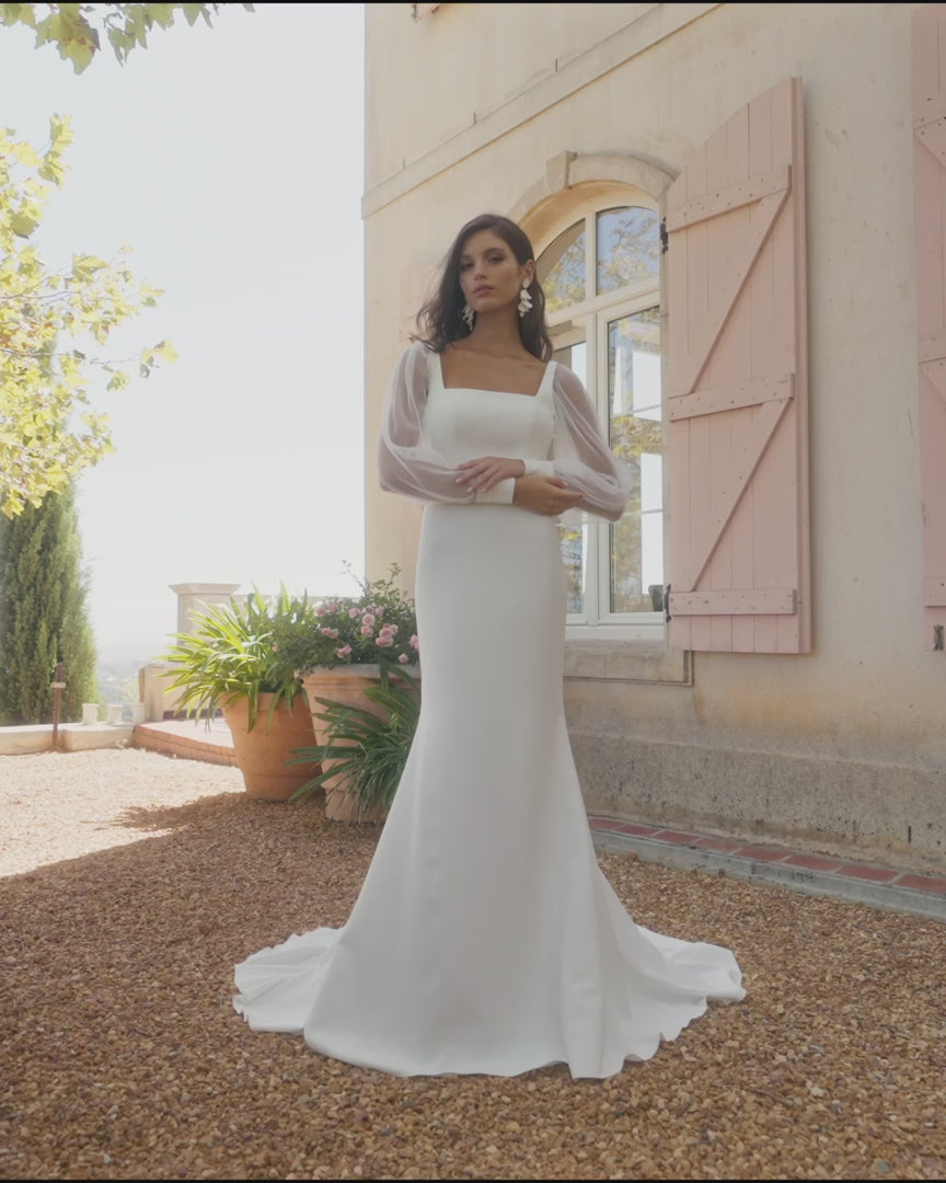 Tate er en tidløs og elegant brudekjole skabt til den moderne brud, der drømmer om et klassisk snit med et stilrent udtryk. Den firkantede halsudskæring fortsætter i ryggen og forbindes af brede stropper, som smukt fremhæver kravebenene og giver en arkitektonisk balance.